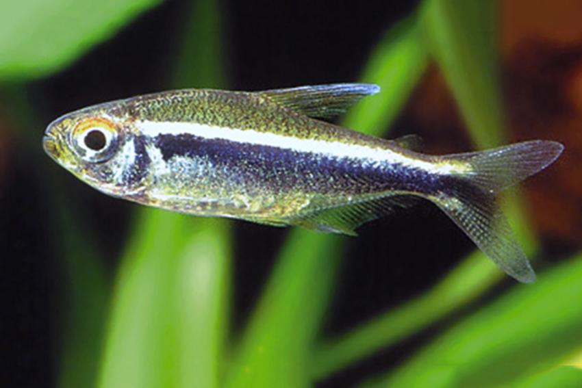 The Black Neon Tetra is a small, peaceful schooling fish from the Paraguay and Taquari River basins in Brazil. It features a sleek silver body crossed by a striking black stripe below a glowing white or neon-green stripe—paired with a faint red eye highlight—making it a standout in planted aquariums. This hardy species thrives best when kept in groups of at least six, displaying its most natural behavior in a spacious, well-planted setup.
