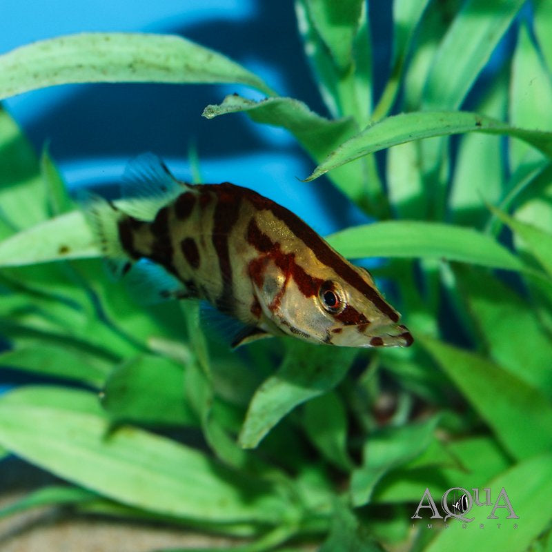 A robust, elongated freshwater fish known for its shimmery brownish-yellow body adorned with dark blotches and pronounced stripes running through the eye and along the lateral line. Some selective captive-bred variants show intensified red or orange fin accents—hence “red stripes.” Its large mouth and rows of sharp teeth mark it as an effective ambush predator.