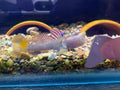 - Striking coloration, typically featuring a combination of bright blues, oranges, and whites